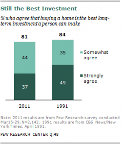 The survey of 2,142 adults, conducted by Pew from March 15 to March 29, shows that 81 percent of Americans believe “buying a home is the best long-term investment a person can make.” The report says that 37 percent of respondents “strongly agree” with the above statement, while 44 percent “somewhat agree.”