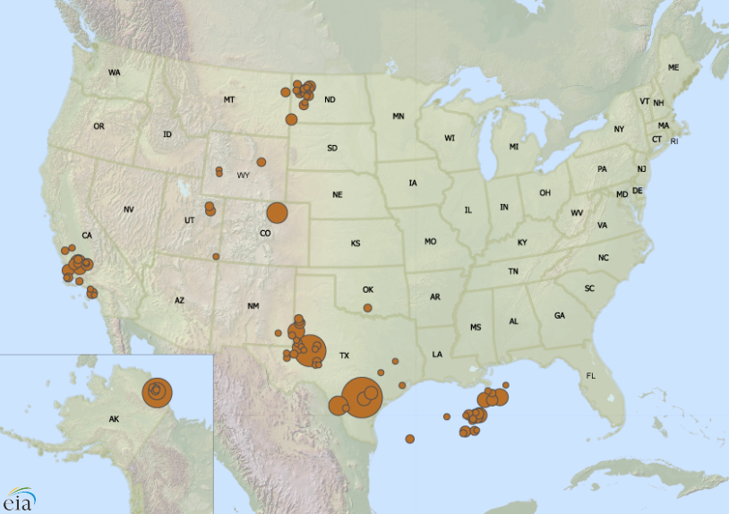 In a recent review from the Energy Information Association, a list of the top 100 oil fields emphasized the important role the Lone Star State plays in U.S. oil production, as three of the top five oil fields were located in Texas. As the below map shows, a majority of the country’s oil fields reside in Texas.