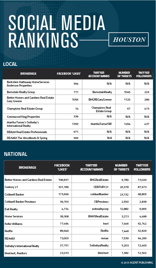 Houston Agent crunched the social media numbers on Facebook and Twitter, and collected the findings in the infographic below. The numbers were pulled the week of May 18 directly from the brokerages’ social media pages, and the brokerages are ranked in alphabetical order.