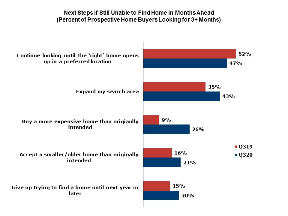When asked what they’ll do next if still unable to find a home in the next few months, 26% of these long-haul house hunters said they’ll buy a more expensive home than originally intended, three times the number of buyers who said they’d use that strategy a year ago.