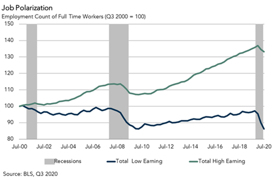 Total low-earning job losses in the third quarter were down 9.6% relative to the first quarter, while total high-earning job losses were only down 2.7%.