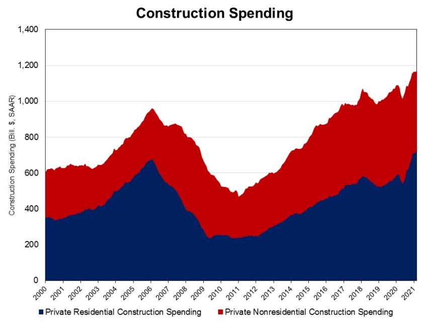 Single-family home construction helped drive a 1.7% monthly increase in total private residential construction spending in March to $725.3 billion, the National Association of Homebuilders reported, citing U.S. Census Construction Spending data.