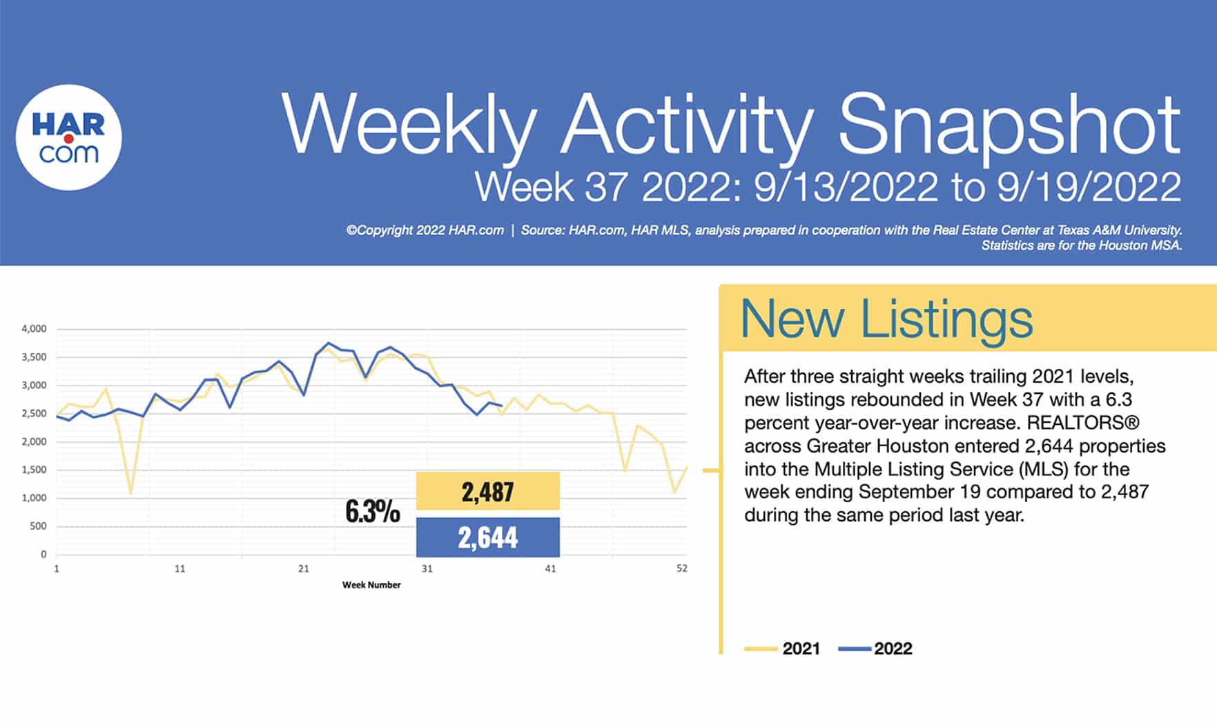 Though new listings have been down from 2021 for the past three weeks, there was a 6.3% year-over-year increase in the amount of properties entered into the Multiple Listing Service from September 13 to 19.