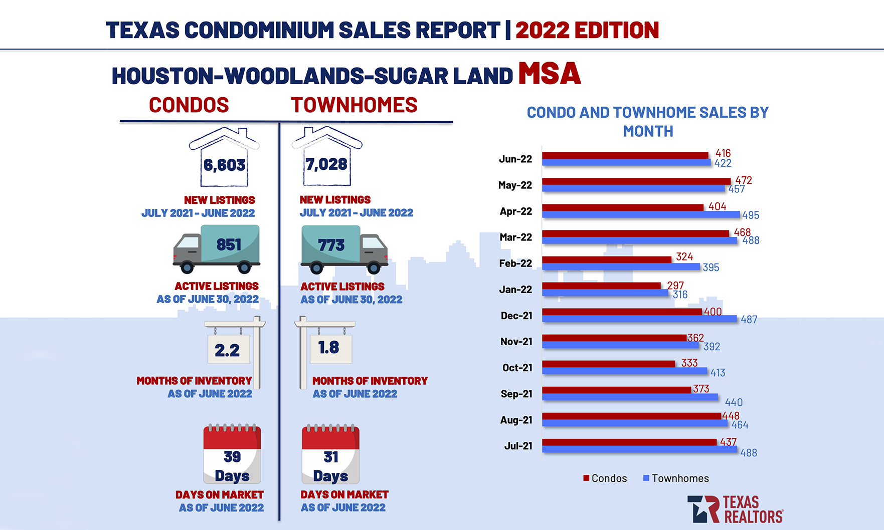 Condominium and townhome sales have stabilized in Texas, according to the Texas REALTORS® 2022 Texas Condominium Sales Report.