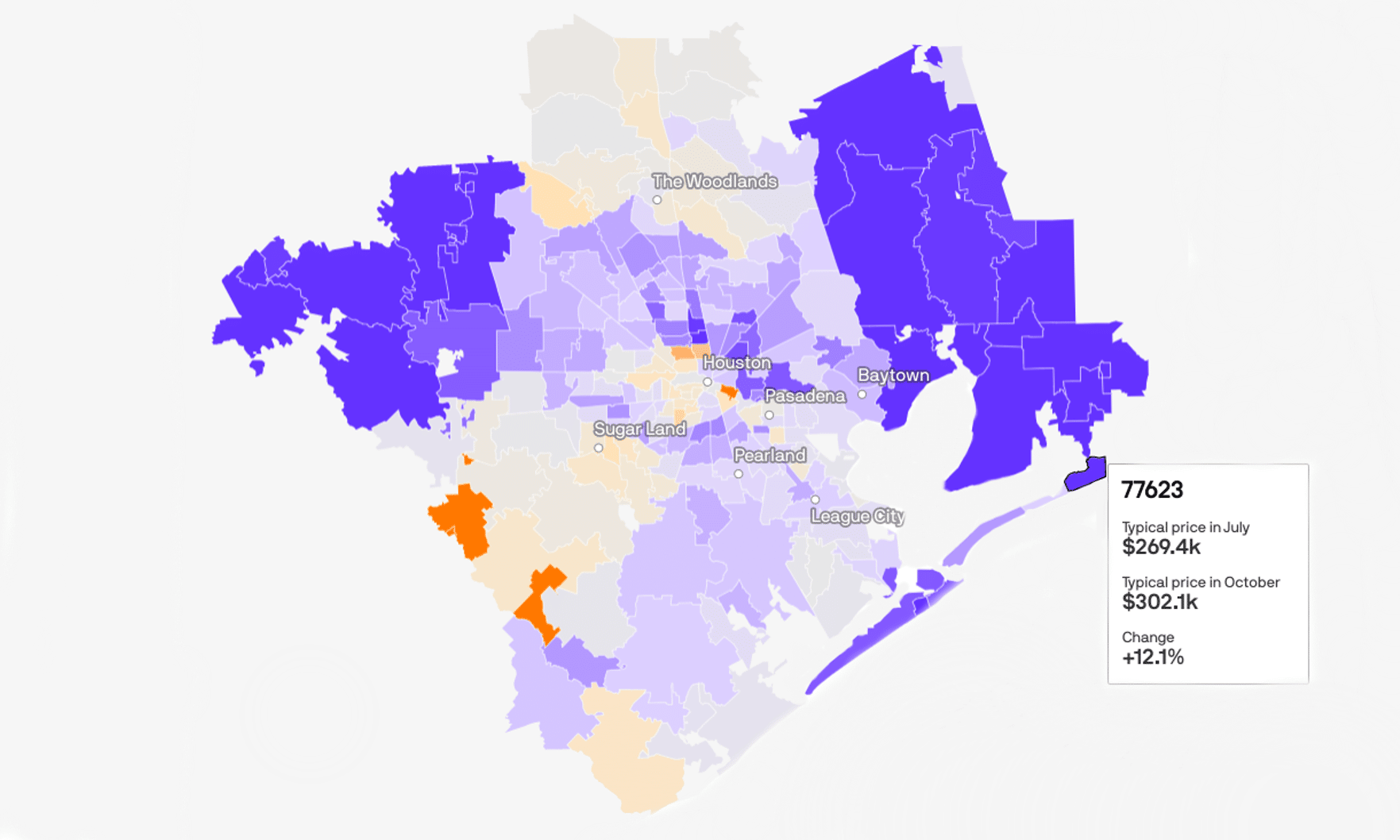 From July to October 2022, the area in the Houston MSA that saw the largest price increase was High Island (area code 77623), where the typical home price rose 12.1% from $269,400,00 in July to $302,100,000 in October. Other areas in greater Houston with notably high price increases were Stowell (+9.8%), Wallisville (+8.6%) Bay City (+8%) and Anahuac (+7.8%).