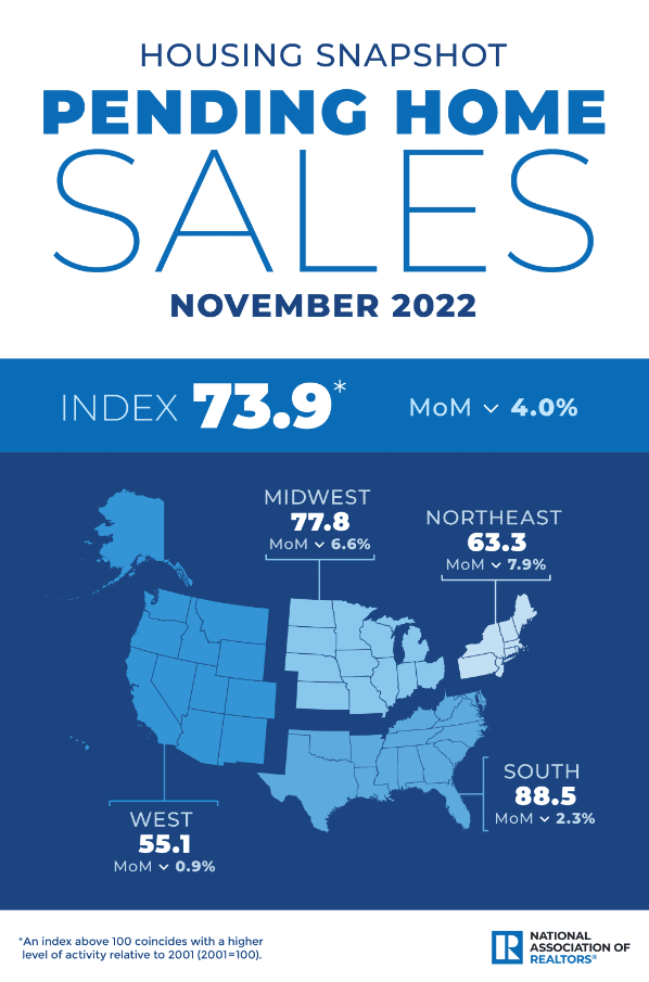 Pending-home sales fell more than expected in November, marking the sixth monthly decline in a row, the National Association of REALTORS® reported, citing its Pending Home Sales Index, which fell 4% from October and 37.8% from November 2021.