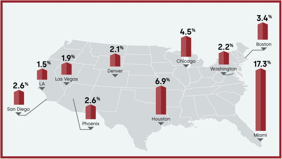 Miami posted the highest annual increase among the country’s 20 largest metro areas, at 17.3%, followed by Houston at 6.9% and Chicago at 4.5%.