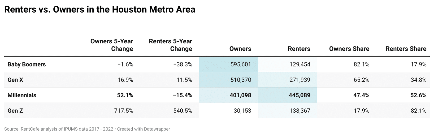 Meanwhile, the Baby Boomer population has decreased significantly in the Houston area in the past five years, with decreases in renters and homeowners recorded. While Boomers still make up the largest share of homeowners in Houston at nearly 600,000, that number is down 1.6% from 2017.