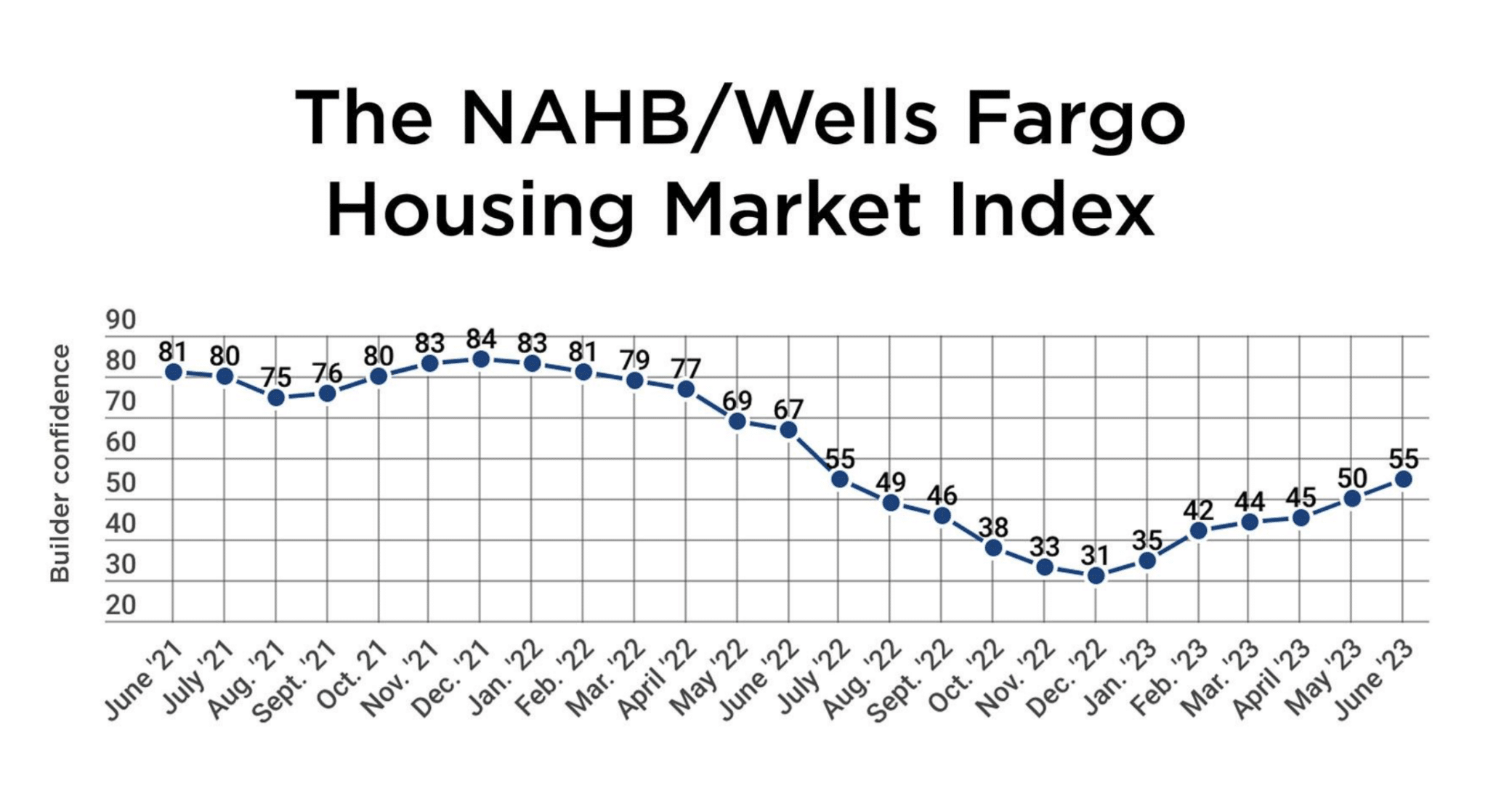In turn, builders are gaining confidence in the market. According to data from the National Association of Home Builders (NAHB), builder confidence was up for the first time in 11 months during May. Based on a monthly survey of association members, the NAHB/Wells Fargo Housing Market Index (HMI) showed confidence was up five points entering June, surpassing, for the first time, the confidence midpoint of 50 seen in July 2022. In all, the index has rebounded by an impressive 77% since December’s low of 33.