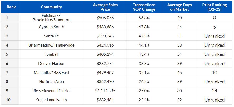 “Elevated interest rates are continuing to fuel the housing market beyond the city limits,” HAR Chair Cathy Treviño said in the report. “Many homeowners are searching for affordable housing and space and that is what many of the outlying communities on this list offer.”