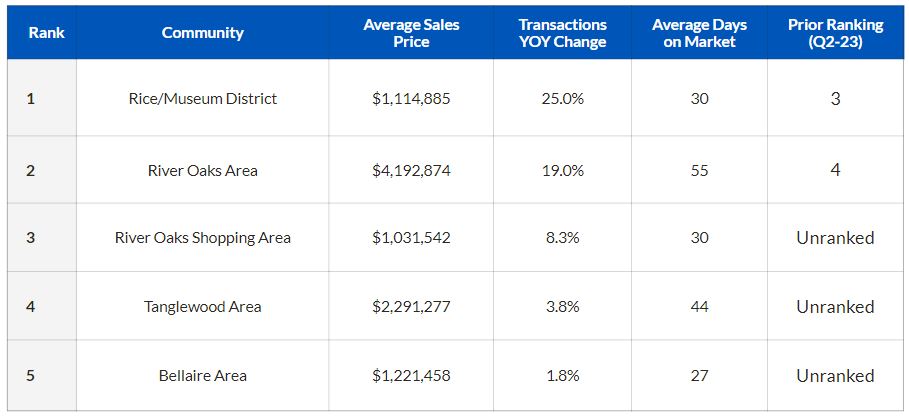 When it comes to the hottest luxury communities, the Rice/Museum District ranked No. 1, with sales transactions increasing by 25% year over year. That district was followed by the River Oaks Area, the River Oaks Shopping Area, the Tanglewood Area and the Bellaire Area.