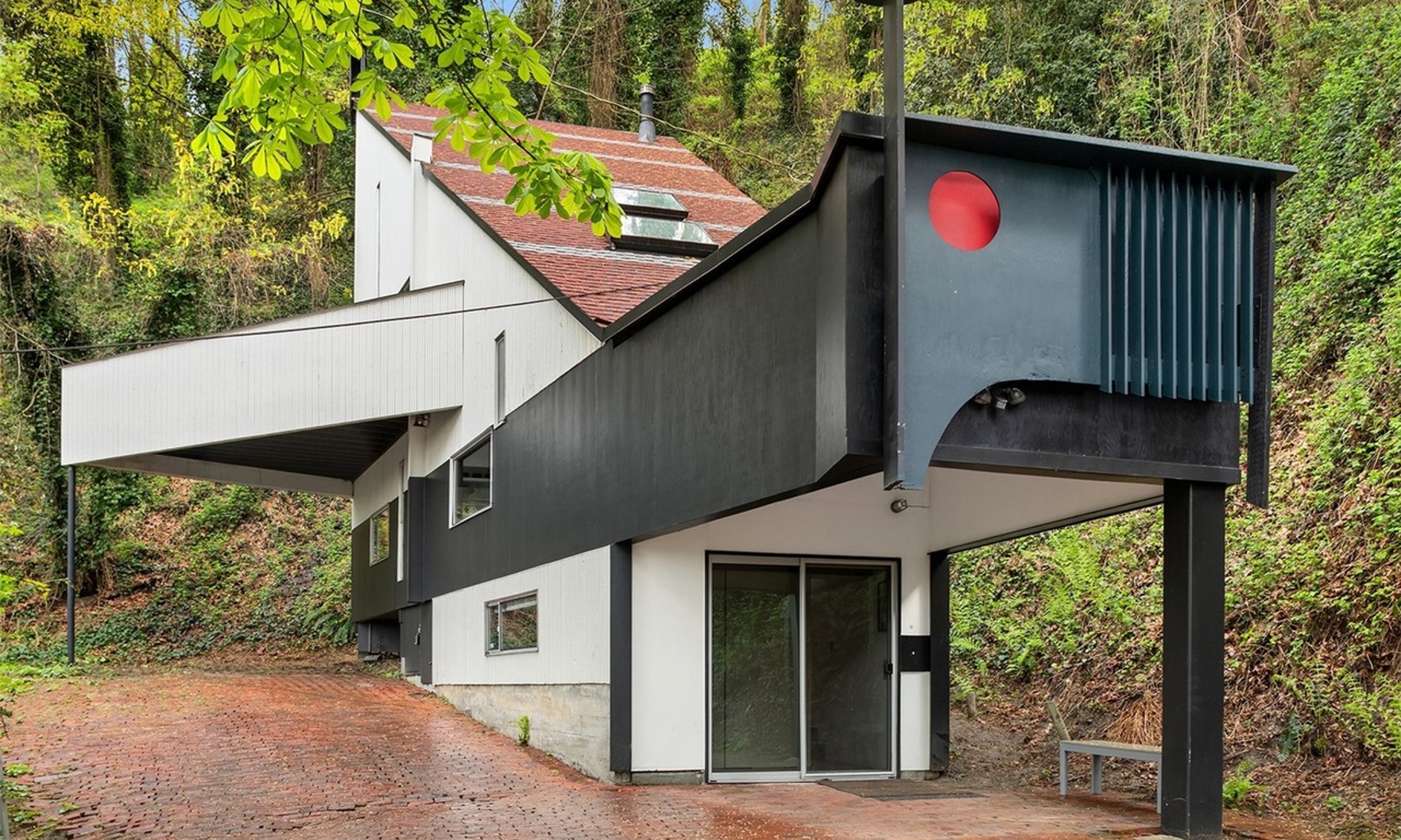 The two-bedroom, two-bathroom property includes unique features like a floating staircase, a triangular terrace and a number of sculptural elements.