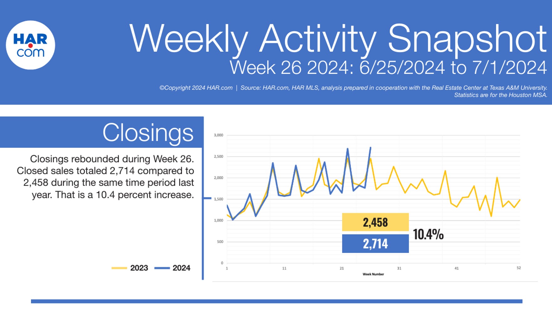 Closings surpassed 2023 volumes during the 26th week of the year, according to the Weekly Activity Snapshot from the Houston Association of REALTORS® (HAR).