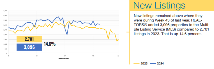 Agents added 3,096 properties to the MLS, up from 2,701 properties during the same week in 2023. Pending listings, or houses that went under contract, rose 5.8% to 1,834 from 1,733.