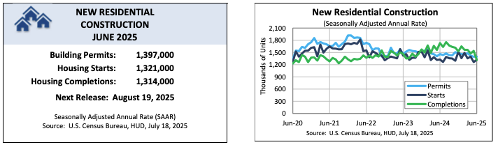 Overall new-home construction, which includes single-family homes as well as apartments, rose 4.6% month over month to a seasonally adjusted annual rate of 1,321,000 units from 1,263,000 units in May, the U.S. Census Bureau and the U.S. Department of Housing and Urban Development reported. Year over year, the rate was down 0.5% from the June 2024 rate of 1,327,000.