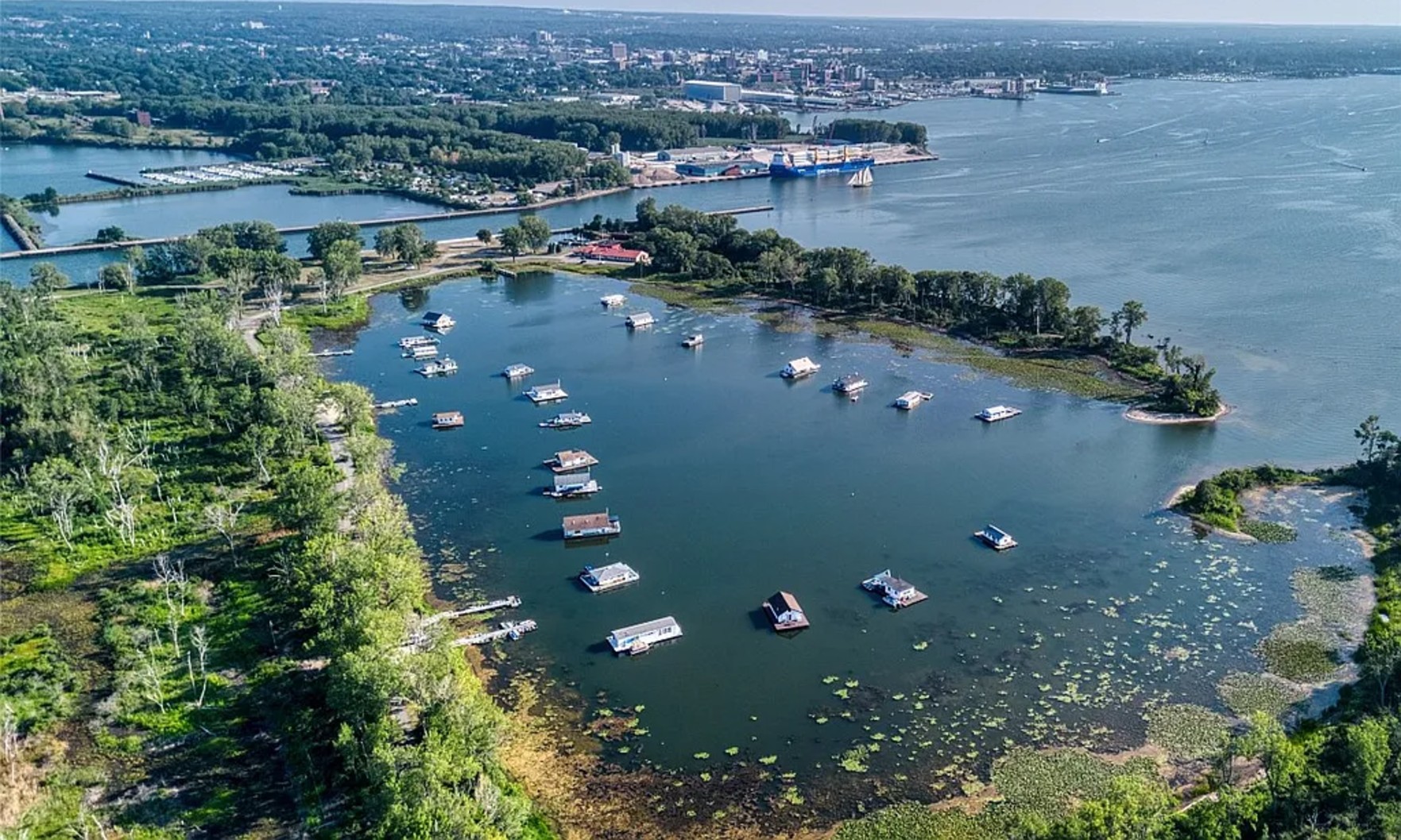 This Erie, Pennsylvania property is both — it’s a three-bedroom, two-bathroom home floating in the middle of Horseshoe Pond, Lake Erie. Transportation not included.