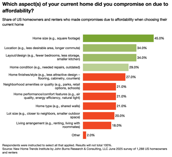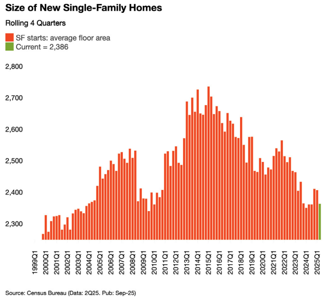 Accordingly, more than 60% of current home shoppers said they’d opt for a smaller home to buy a new one, ULI said, citing a survey by John Burns Research and Consulting. The average size of a new single-family home fell to 2,386 square feet in the second quarter of 2025 from a high of 2,692 square feet in 2016.