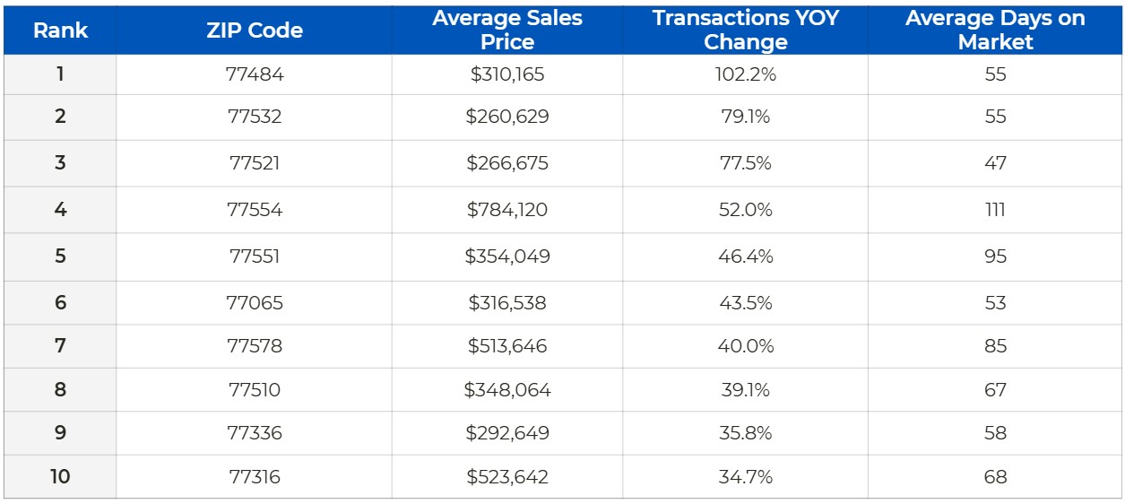 The association tracked the top 10 ZIP codes with the greatest year-over-year increases in home sales and found that 77484 — Waller — was the hottest in the entire Houston metro area, with home sales increasing 102.2% compared to the fourth quarter of 2024. The typical home there had an average sales price of $310,165 and spent 55 days on the market.