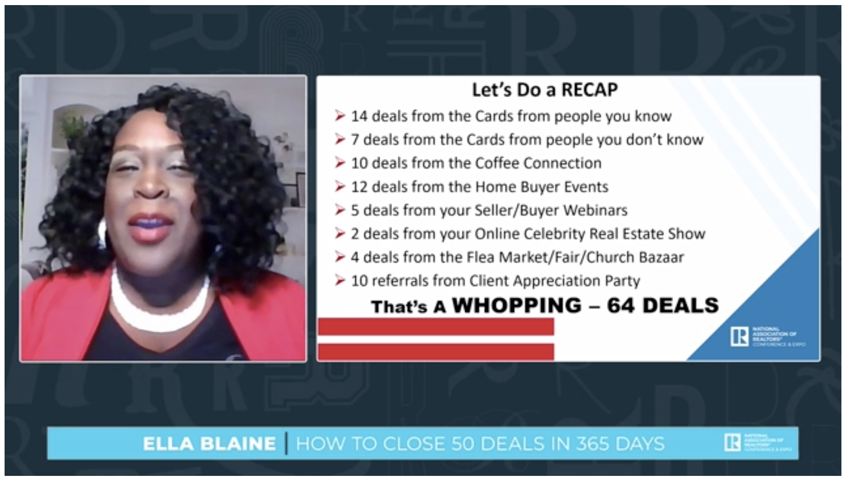 Coach Ella Blaine, who is a real estate coach and founder of Real Estate Ladies Rock FB group, offered tips on how to achieve the goal of closing 50 deals annually and go even further in her webinar at the 2020 Realtors Conference and Expo.