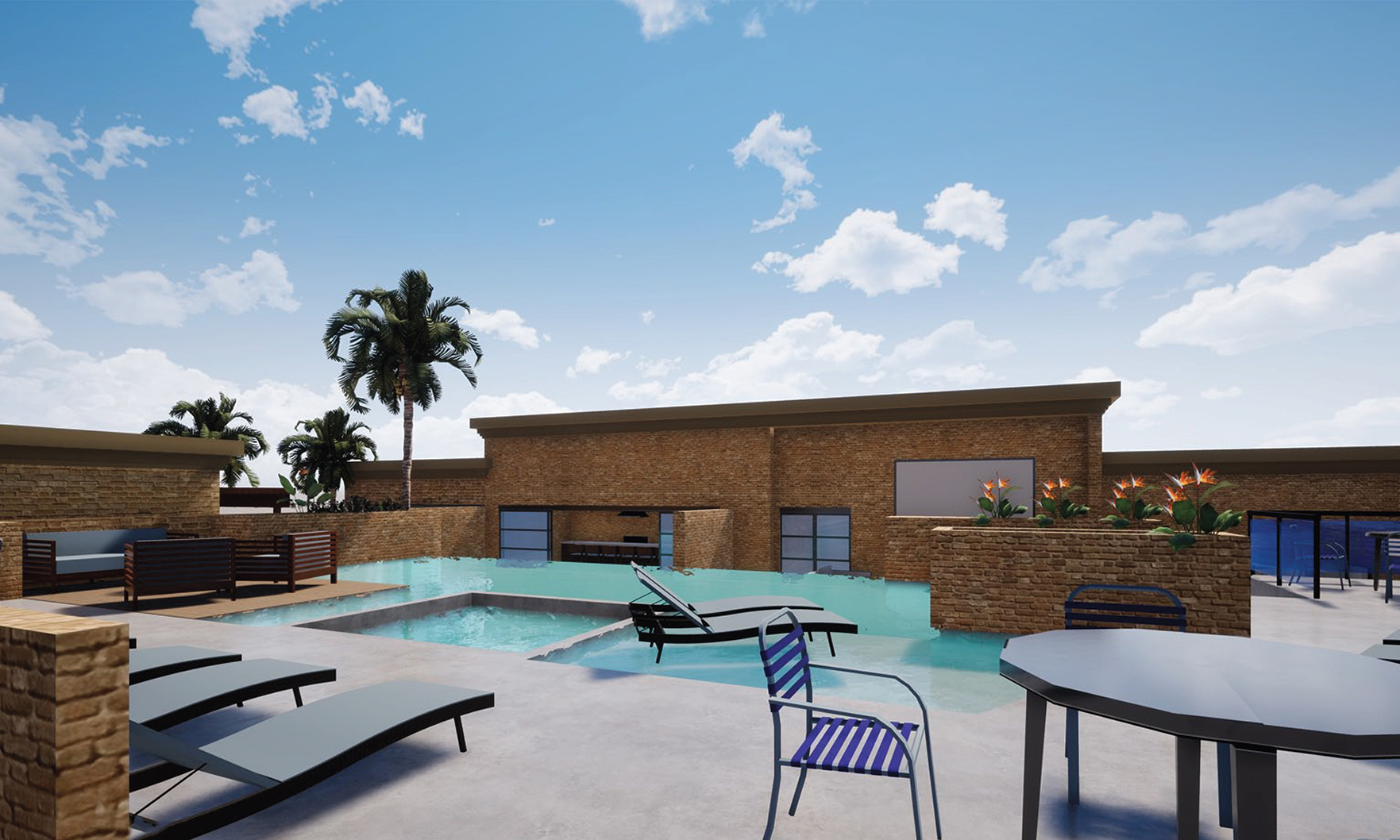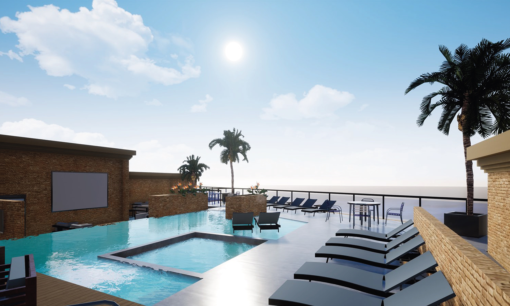 The main amenity is the ninth-floor rooftop deck featuring fantastic views of downtown Houston’s skyline. Residents will enjoy an infinity-edge pool, outdoor kitchen, dining table that seats 16 guests, lounge furniture, fire pit and entertainment area with a 10-foot projection screen visible from the pool.